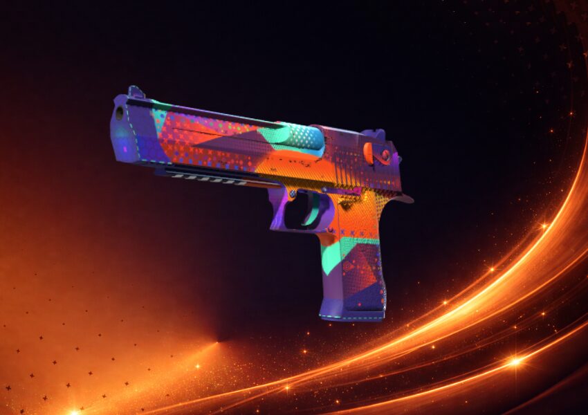 It is the essence of the Miami Vice style. Every centimeter of the pistol has been covered with bright, geometric patterns in orange, yellow, turquoise, and purple colors. This is one of the most colorful finishes available for the Desert Eagle. In full sun on CS2 maps, this skin generates very strong color saturation.